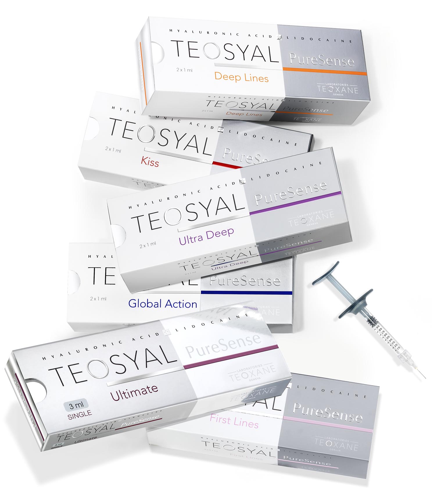 Teosyal dermal filler is a sophisticated hyaluronic acid filler line known for its customizable options, natural tissue integration, flexibility, and broad applications. With formulations suitable for fine lines, deep folds, volume loss, and full facial rejuvenation, Teosyal offers smooth, reversible, and natural-looking results when administered by licensed medical professionals. The variety within the RHA, PureSense, and Ultimate product families makes Teosyal a versatile tool in modern aesthetic medicine.